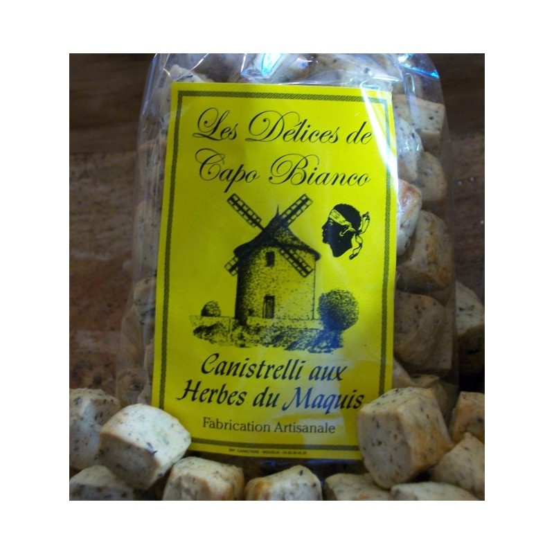 Biscuit corse par excellence! Nouveau une jeune femme du CAP CORSE, le remet au goût du jour en faisant des canistrelli salés aux olives, aux herbes du maquis, aux oignons, pouvant se consommer à l'apéritif dans les salades et les potages. Ingrédients : Farine de blé, vin blanc, mati