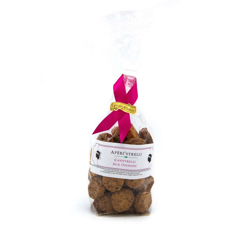 Canistrelli salés oignons CAPO BIANCO Le canistrellu biscuit corse par exellence! Nouveau, une jeune femme du CAP CORSE, le remet au goût du jour, en faisant des canistrelli salés, aux olives, aux herbes du maquis, aux oignons, pouvant se consommer à l'apéritif, dans les salades et