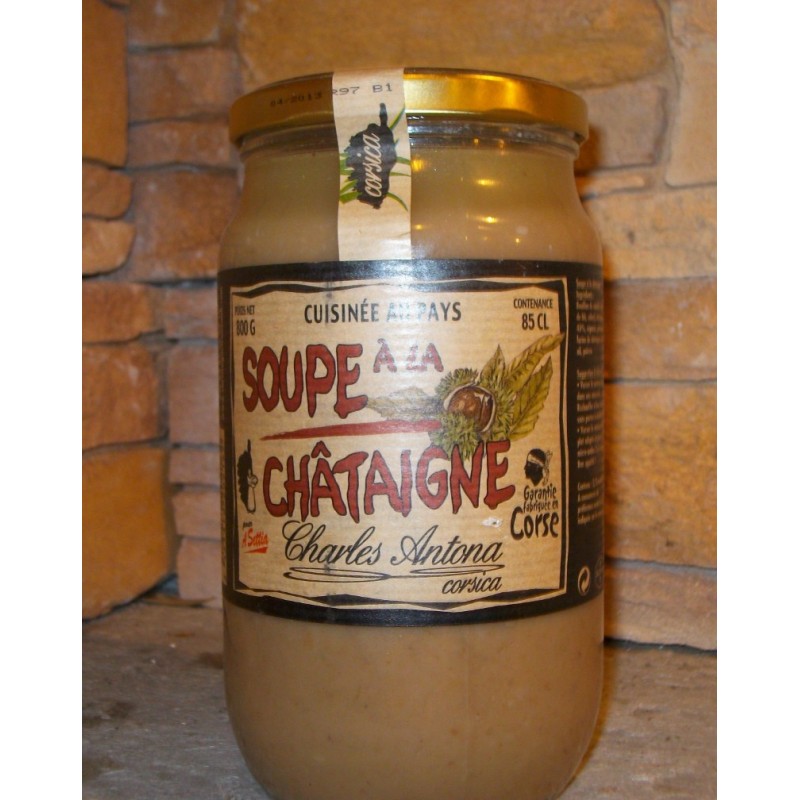 Ingrédients:Bouillon de volaille farine de blé,céleri),châtaignes 40%,oignons,poireaux,farine de chataigne,sel,ail,poivre. Suggestion d'utilisation:.Verser le contenu du pot dans une casserole.Réchauffer à feu doux sans porter à ébullition.Verser le contenu dans un plat adapté et passer au micro-ondes 3 à 4minutes.Bon appétit!Contenu:deux à trois assiettes.Trés bon avec des morceaux de foiegras à la liqueur de myrte corse ou morceaux de foiegras au muscat corse sur des tranches de pain avec un bon verre de vinrougecorse et c'est un vrai régal.